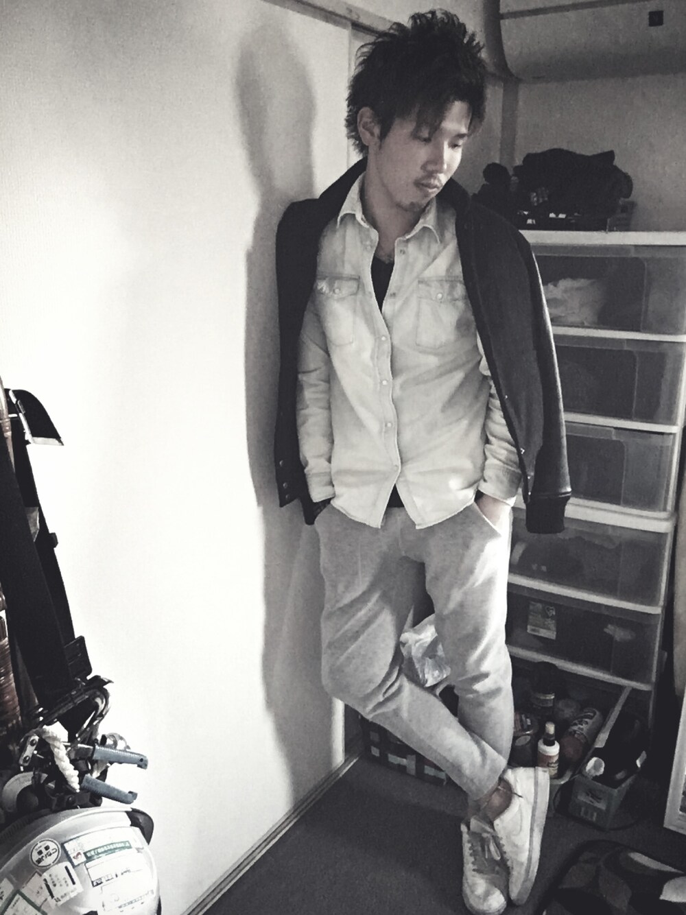 ちょっとした外出に、スエットパンツとジーンズシャツの組み合わせ 特にYEVSのスエットパンツは個人的にオススメ! スニーカーとの相性も、抜群!