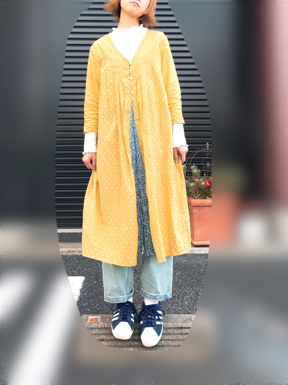 いつもありがとうございます🙏 インナートップスとデニムが同じでも、重ねるものを変えるだけで、また違った感じに。 春に着たくなる色♡ ドット×花柄♡