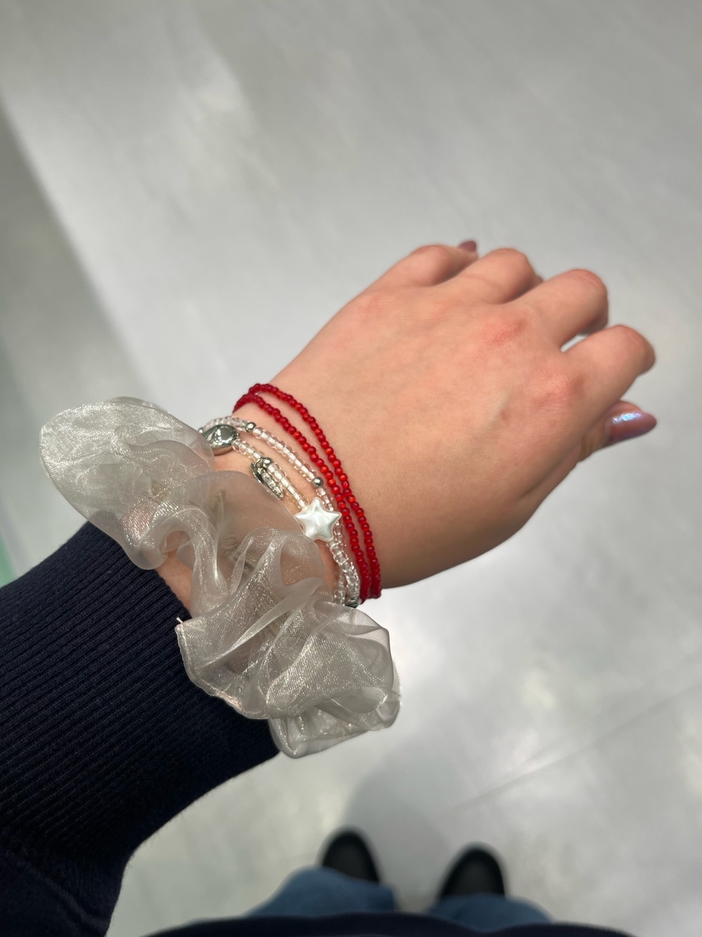 ネックレスを使ってブレスレットにアレンジ✨ 鎖骨くらいの短いネックレスは、手首に回せばブレスレットにも使えちゃいます!! ビーズのブレスレットは、サージカルステンレスなので、水や汗にも強く錆びにくいアイテムです!! 金属アレルギーの方も個人差はありますが、使っていただけるアイテムになっております🙆♀️✨ ビーズのブレスレットは2セットなので、2点で1アイテム!! レイヤードしてもよし◎ 別々で使ってもよし◎ コーデの幅が広がるアイテムになってます!! シュシュはSMELLY HEPFIVE店限定のロープライスアイテム!! こんなにボリュームあっても¥550-とSMELLYだとかなりお得なアイテムになっております🔥
