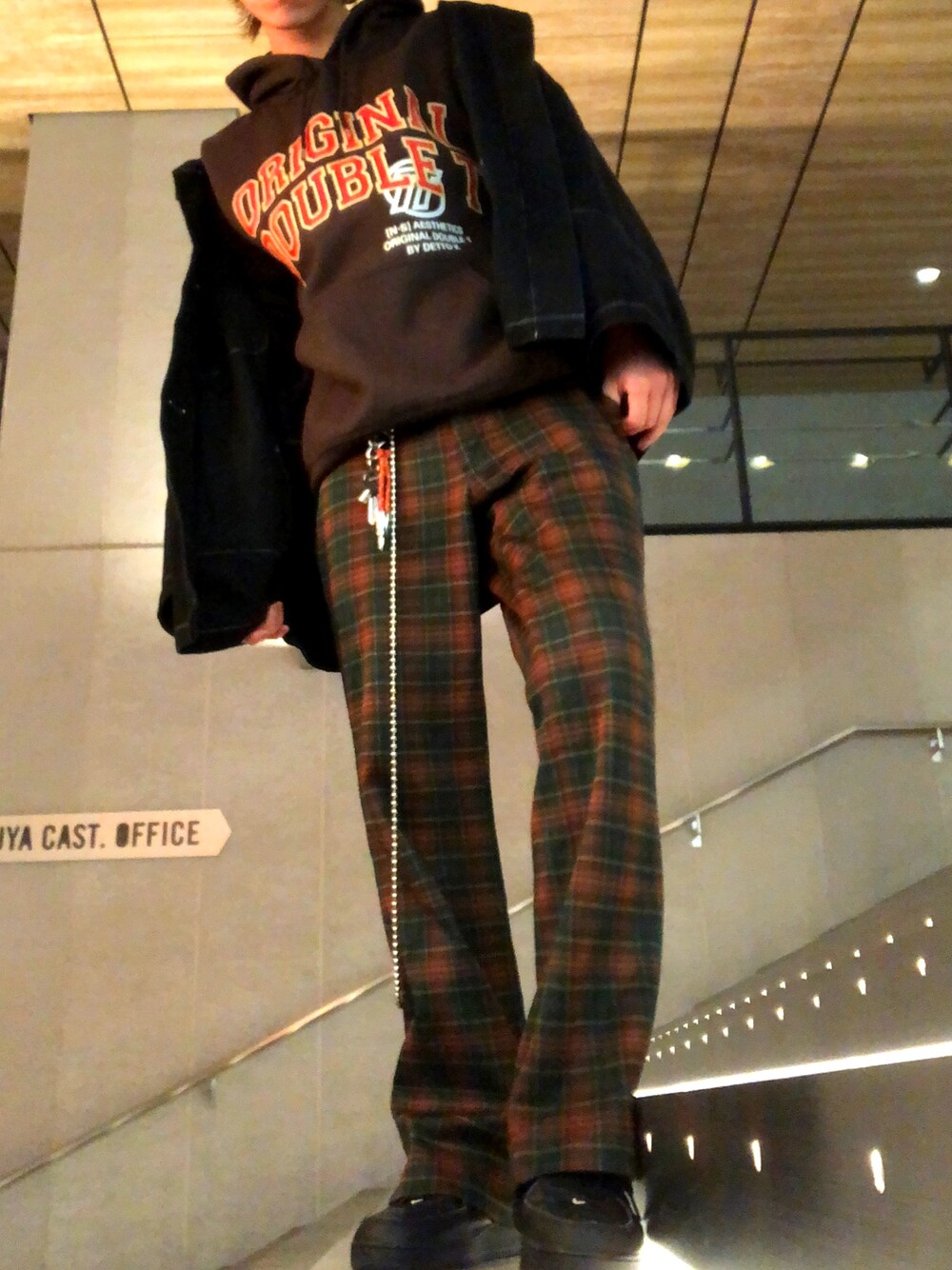 今気になってるブランドのD.TT.Kのフーディを中心に茶色系でまとめました。 faith tokyo(古着屋)で購入したチェックパンツとボールチェーンを着用しています。 キーホルダーはクリスチャンダダの物です!