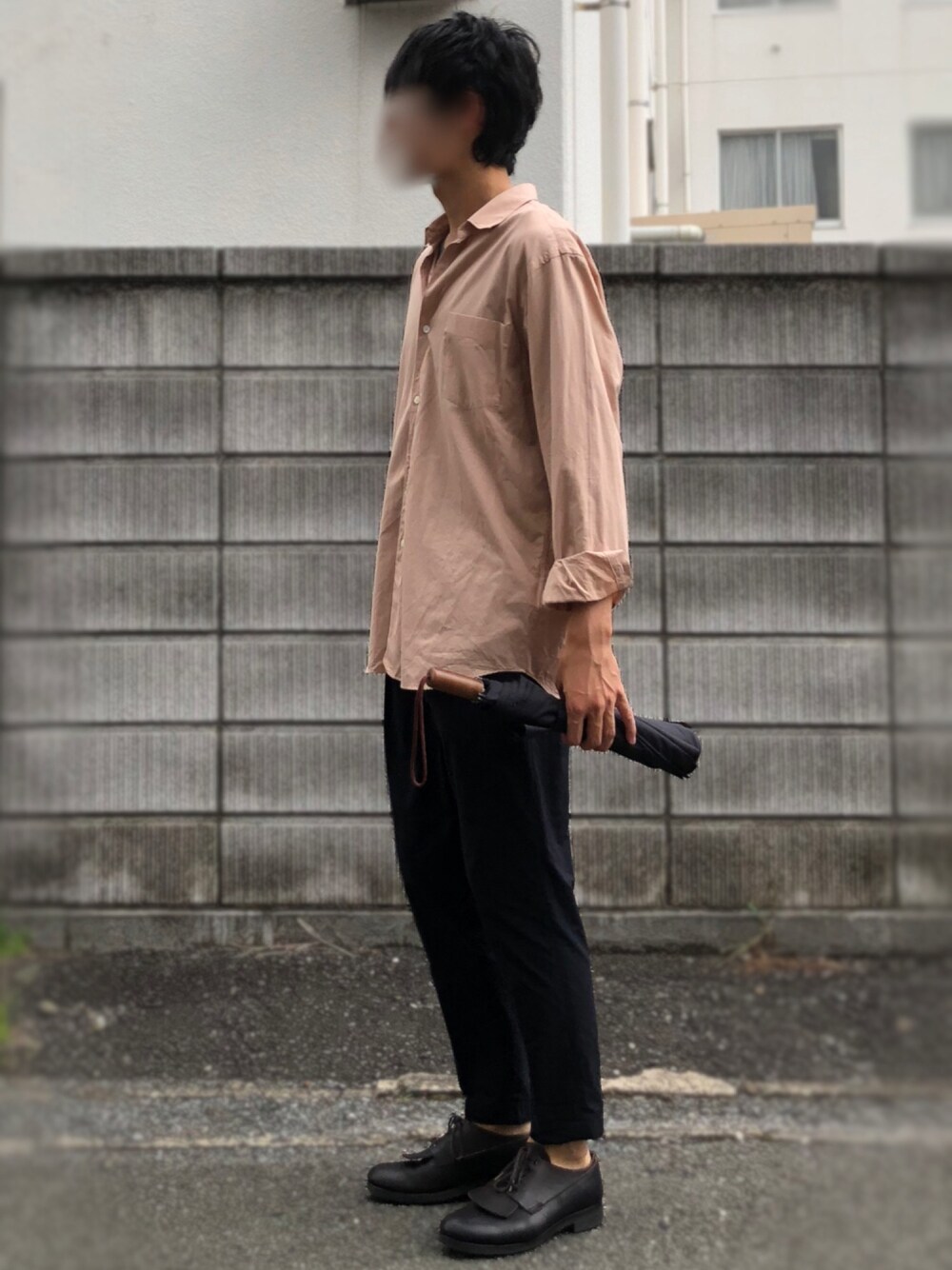 細いボトムには少し靴のボリュームがほしい。 コモリシャツ。黒ボトムとの合わせしかアップしてなくてちょっと残念ですが。。 雨対策バッチリのつもりでしたがちょうど外を歩いている時間は降られなかった。