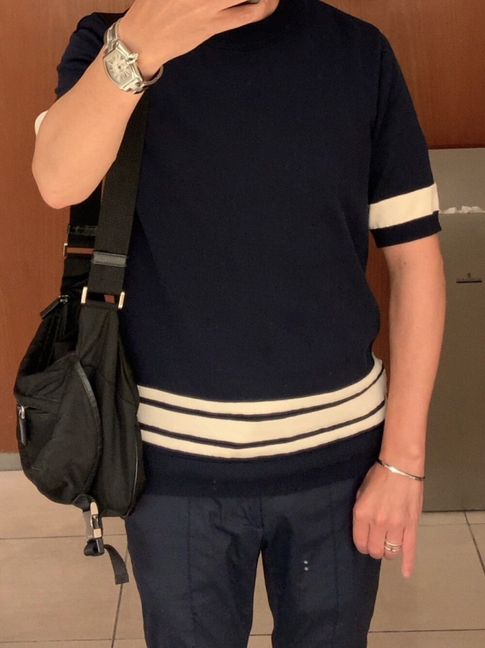 休日コーデ。 紺のシンプルなワントーンコーデですが、シルバーアクセサリーを数点投入して、少し華やかさをプラス。 薄着になりやすい季節は、アクセサリーで!!