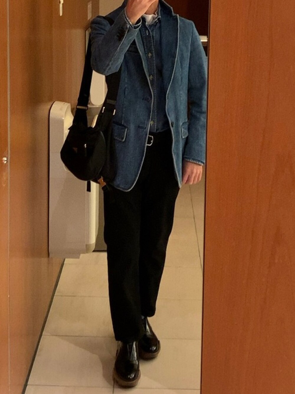 暖かくデニムジャケットでコーデ 鞄は、ヘビロテのナイロン素材で軽さを演出。