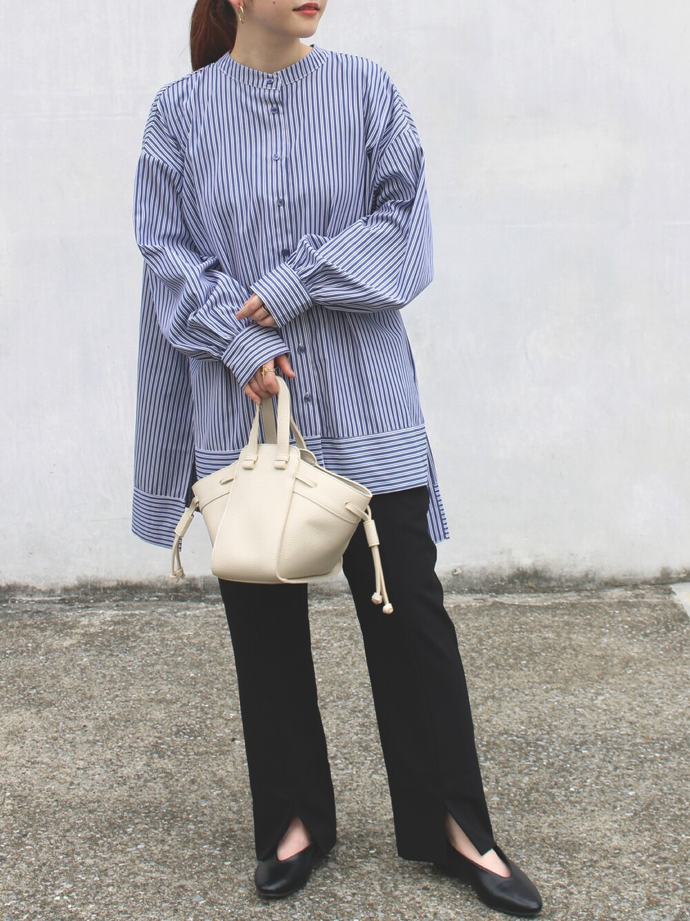 fuji(LAVEANGE)のシャツ/ブラウス「バンドカラーストライプチュニックブラウス」を使ったコーディネート