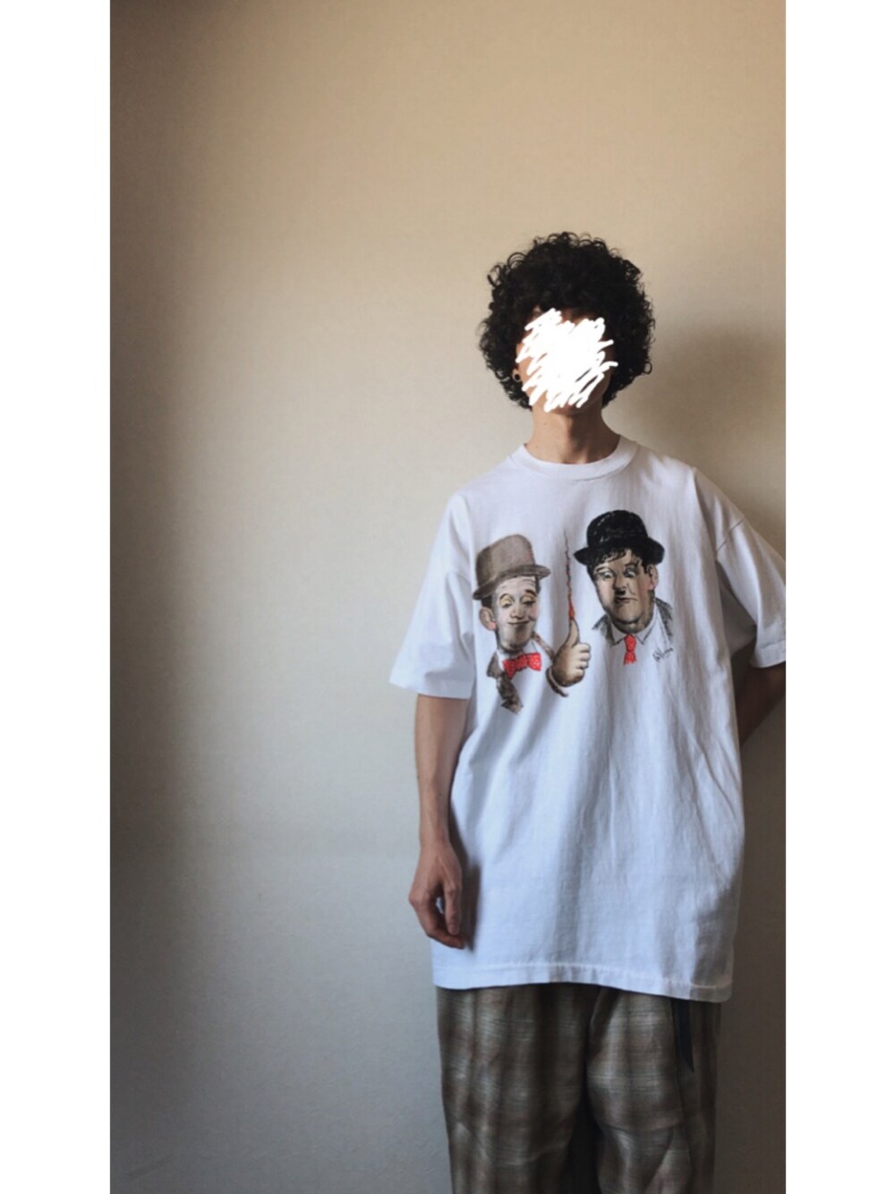ホワイト系のTシャツ/カットソー、ベージュ系のスラックスを着用したメンズの夏コーディネートの1枚目の写真
