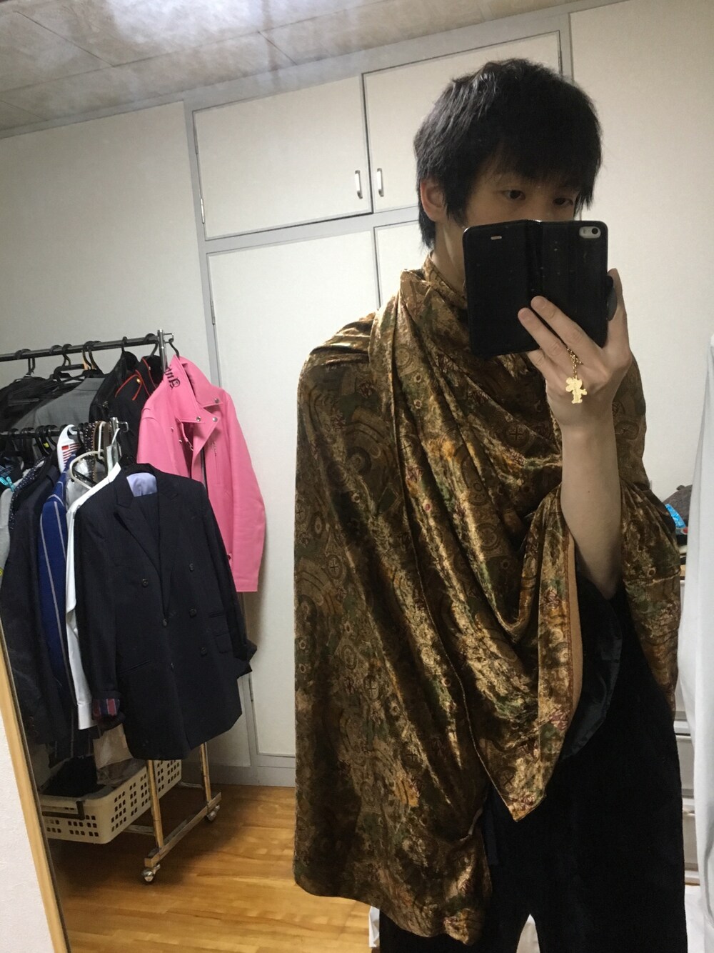 ビンテージの巻きスカートの柄が気に入って買ったものの(*・Å・)スカート男子って感覚は覚えれず、首に巻いたら何か旅人みたいになった。。 有りかわからないけど、今度何か合うのないか探してみよ。。