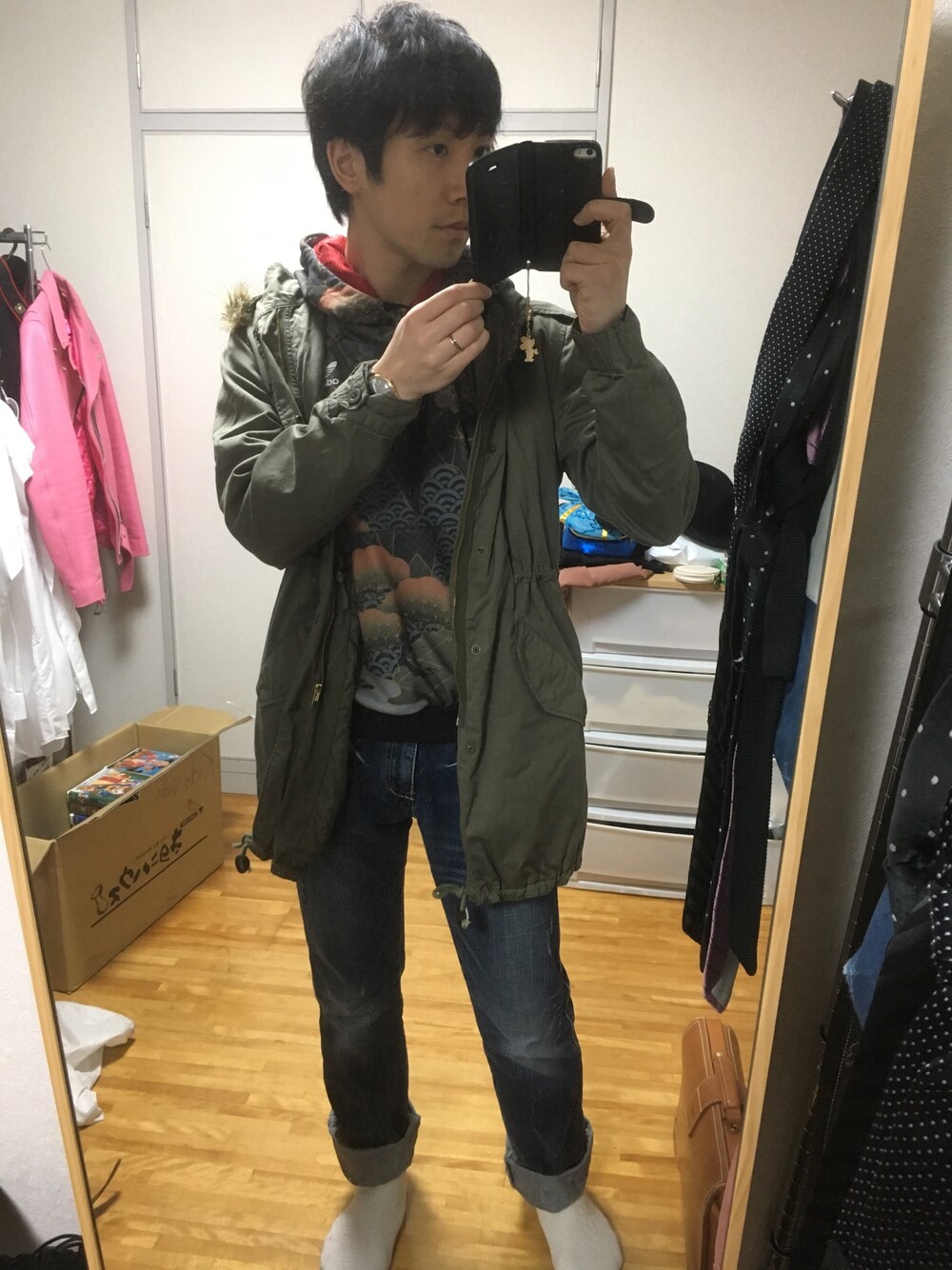 (*・Å・)adidasの和柄プリントのパーカーとミリタリーコートの組み合わせ