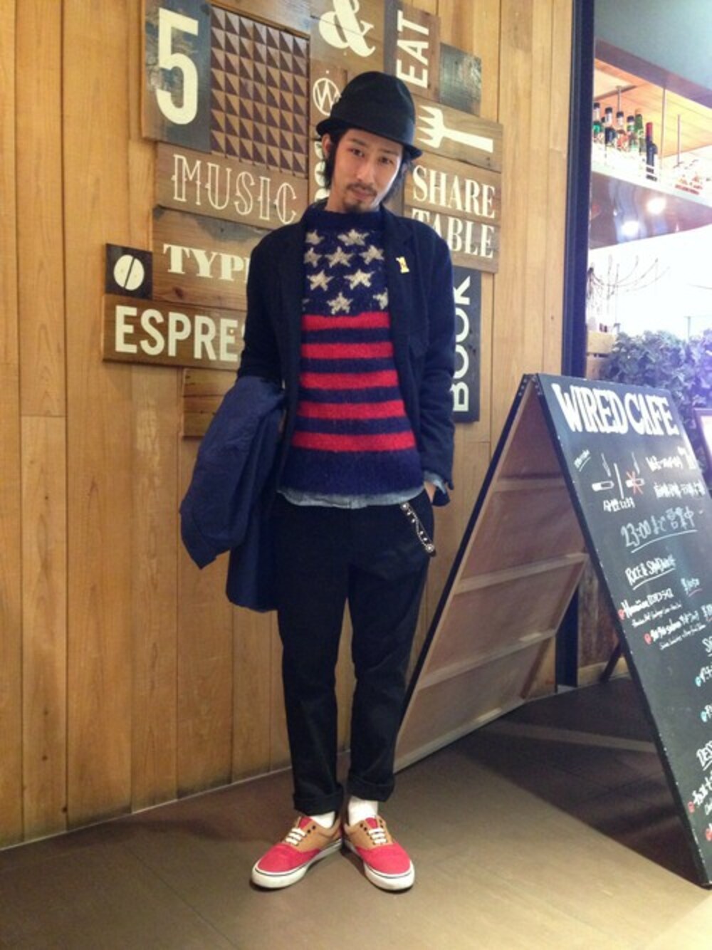 ファンキーパーティースタイル☆ ハット+ジャケットに星条旗ニットとスニーカーで遊び心をプラス。