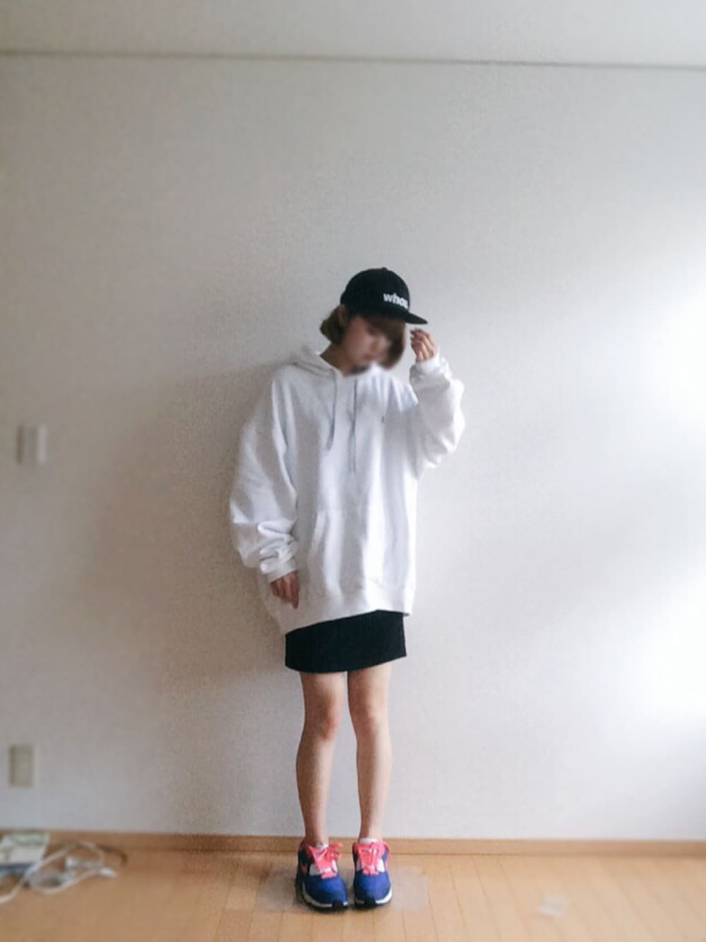 ダボダボなパーカーはメンズもの スポーツなアイテムに下はかっこいめの黒タイト 今日のはずしはタイトスカート だいすきなスタイリストさんをまねてみました。