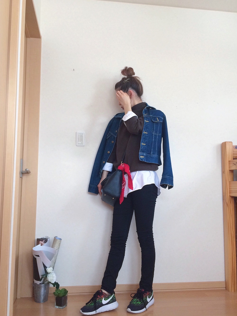 久々ハズシアイテムにNIKEの靴ちゃん 冬っぽいハイネックニットの下にメンズシャツをレイヤード😐😐