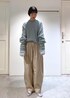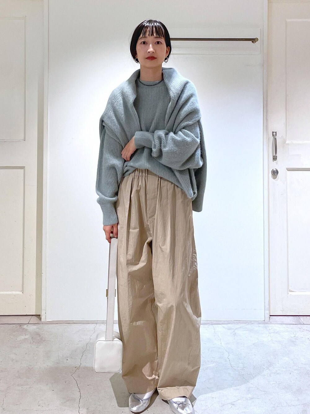 フォックスウールのニットとカーディガンのご紹介。 カーディガンとプルオーバーの色を合わせて、ボトムスはページュのカーヴィーパンツ。 淡いトーンでスタイリングしました。 パンツの形、履きやすさとってもおすすめです! チェックしてみてください!