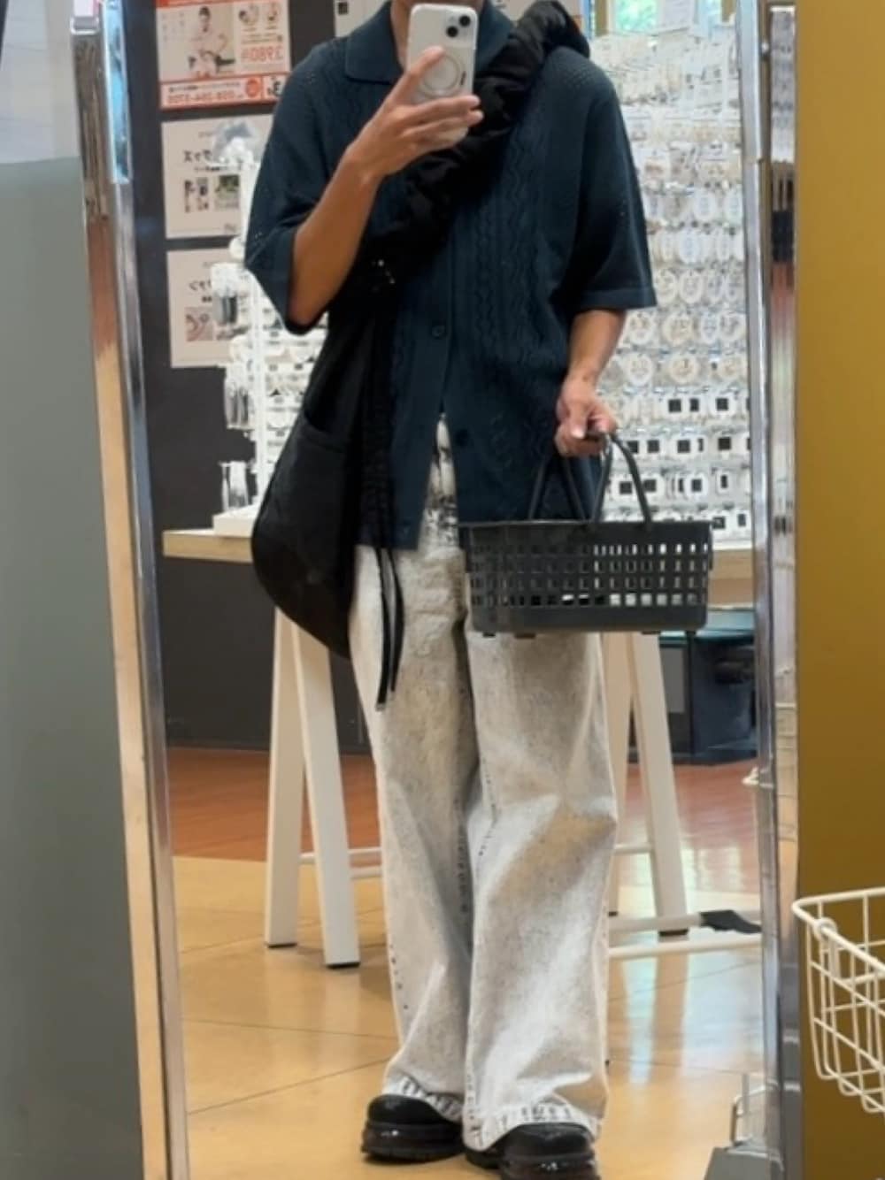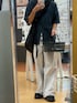 シンプルなシャツではなく透かし編みにして一癖あるシャツ。足元に溜まりを作ることでしっかり馴染む。