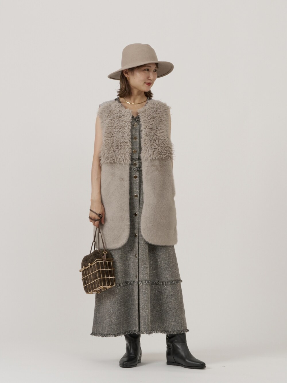 トレンドのニットジレをワンピースにレイヤード。 グレートーンでスタイリッシュな印象にしています。 ネックレスやワンピースのボタン、バッグにゴールドをあしらって華やかさをプラス。 秋のお出かけにおすすめです。 【フェイクファーコンビニットジレ】 高級感のあるフェイクファーを組み合わせたニットジレ。 羽織るだけで一気にトレンド感あふれるコーデに。 【ノンウールツイードフリンジフレアワンピース】 着るだけでコーデがオシャレ見えするワンピース。 インナーを楽しむだけでなく、今回のようにジレを合わせたスタイリングもおすすめ。 *サンプルのため実際より丈が長いものを着用しています。 サイズ詳細は商品ページをご覧ください。