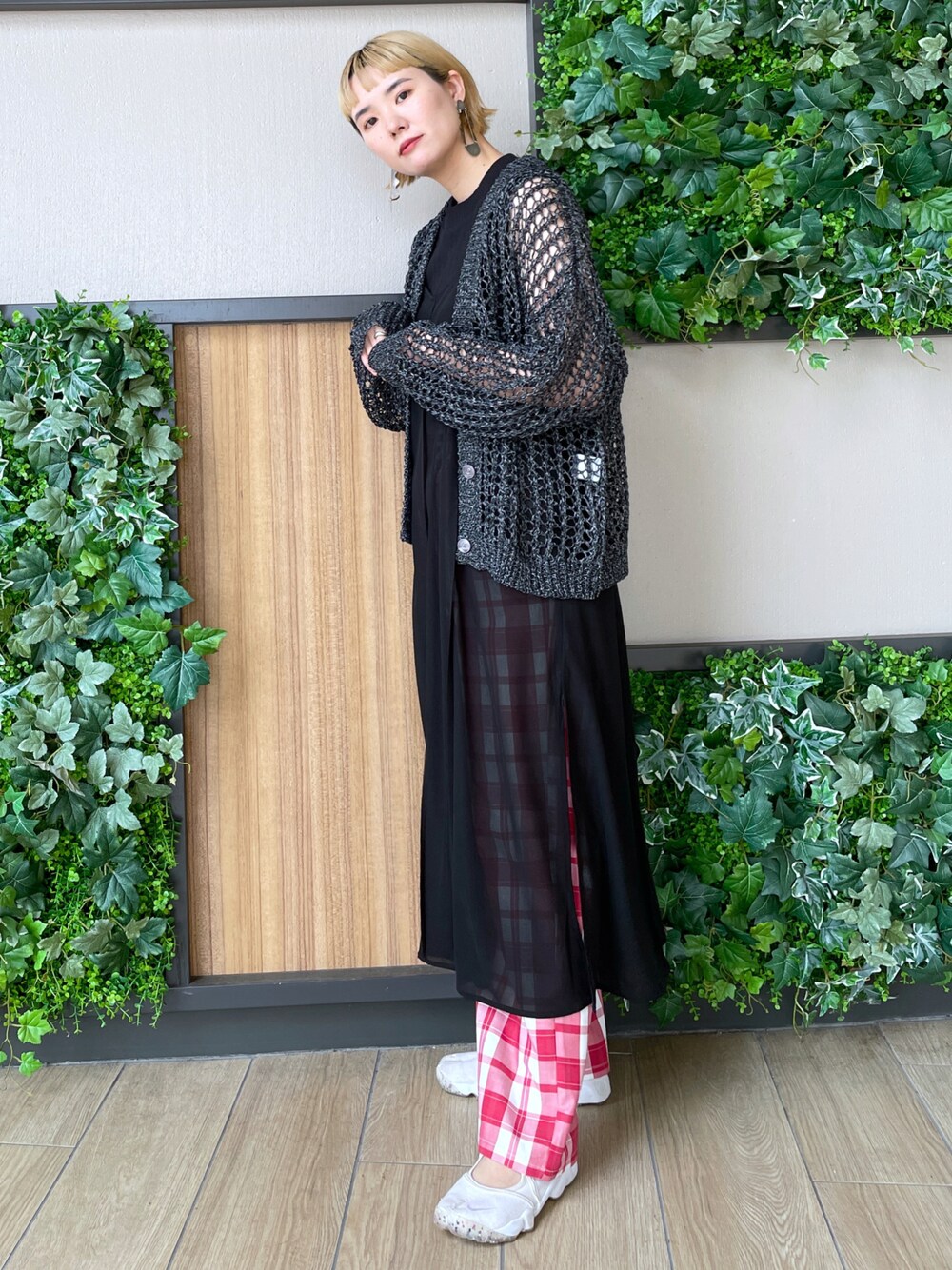 【レイヤード】 メッシュカーディガンは、ボトムやワンピース幅広く合わせて頂ける優れもの。中のインナーを変えて頂くと真夏まで着用可能です! 透け感のあるワンピースは甘くなりすぎないように、パンツとのレイヤードにしてみました◎