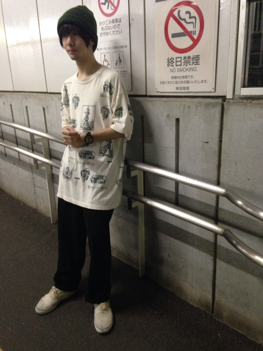 ニット帽/ used/ framingo Tシャツ/ used/ iroha ズボン/ used/ birth death くつ/ yasumn