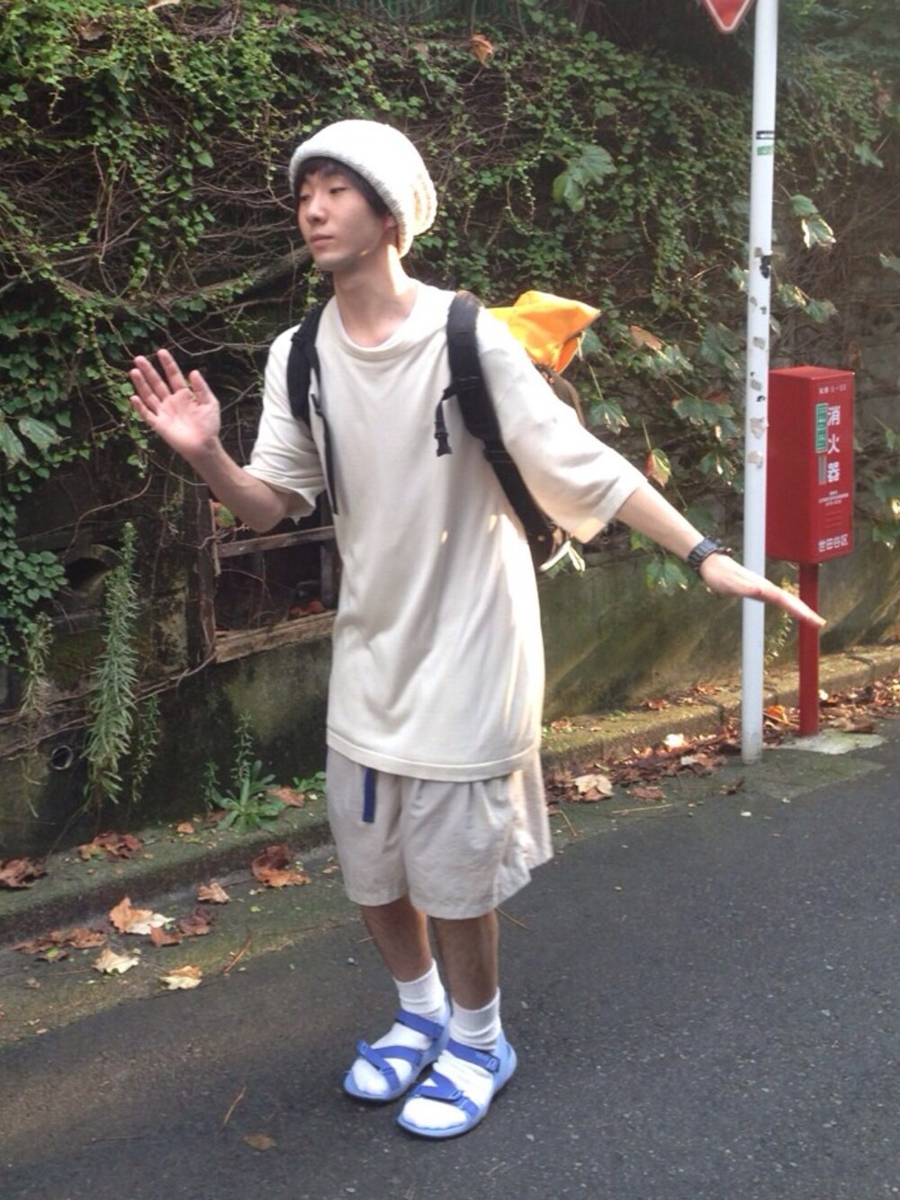 ニット帽/ iroha 半袖ニットTシャツ/ used/ tredichi インナー/ used/ iroha ナイロンショーツ/ used/ iroha 靴下/ feets サンダル/ teva/ iroha バックパック/ bagwarks