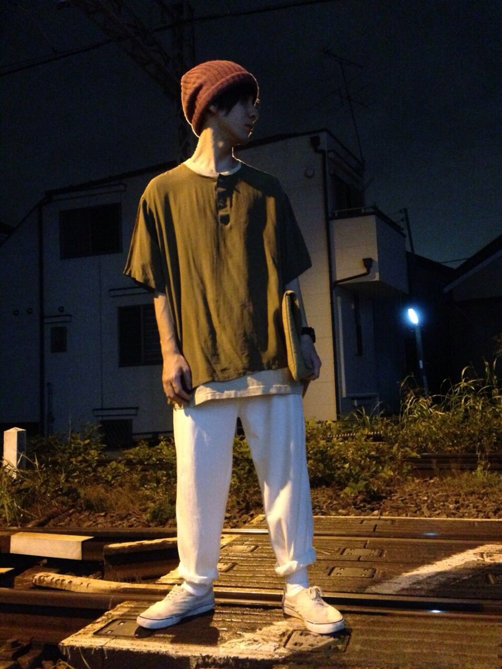 ニット帽/ / ALASCA ヘンリーシルクTシャツ/ used/ iroha インナー/ used/ framingo スウェットパンツ/ used/ MESEN くつ/ /yasumn