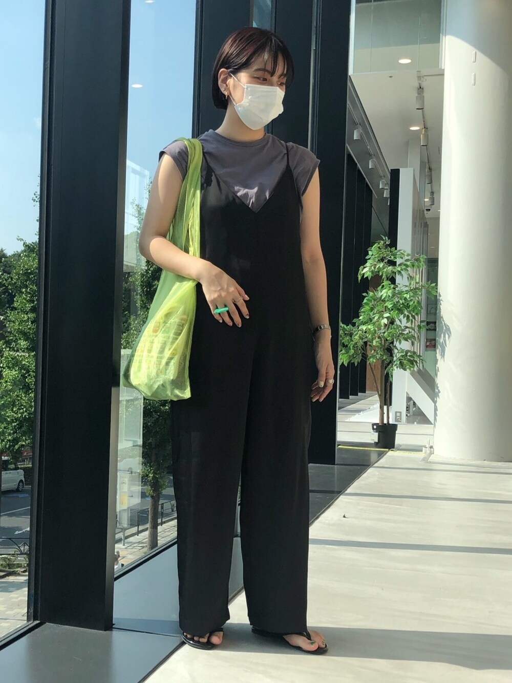休日コーデ🎧 この日もすごい暑かったのでフレンチスリーブで☆ 今年になってサロペットやオールインワンにハマり出しましたがすごい楽で抜け出せなくなる、、(笑) ワンポイントでオーロラバッグを持ったのがポイントです💚大好きなグリーンで💚
