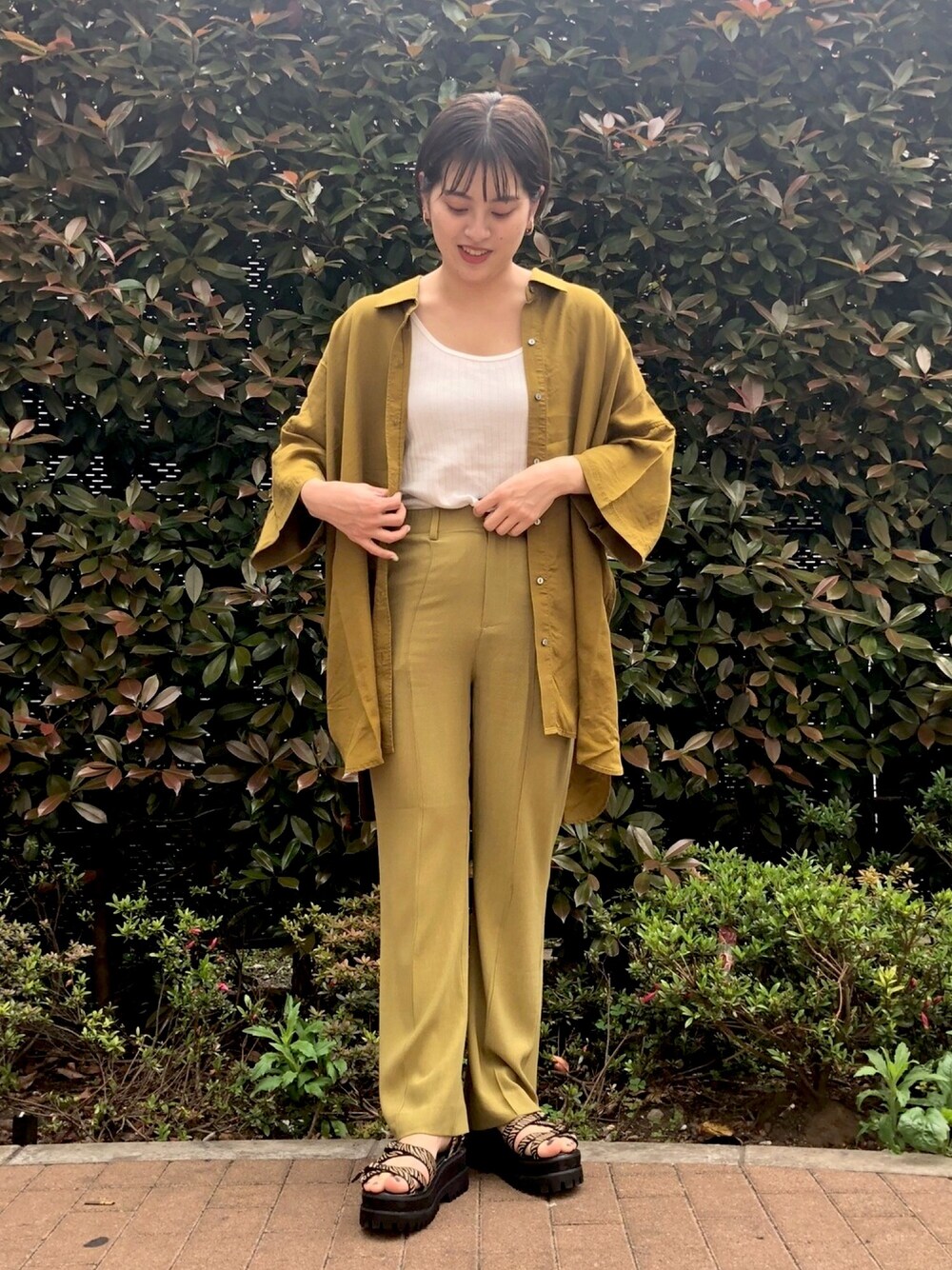 ワントーン🍋 セットアップ風に着てみました🐏 どっちもサラサラテロテロ素材で着心地最高😭✨ シャツはロールアップすればもっとスッキリ!夏でもいけます◎