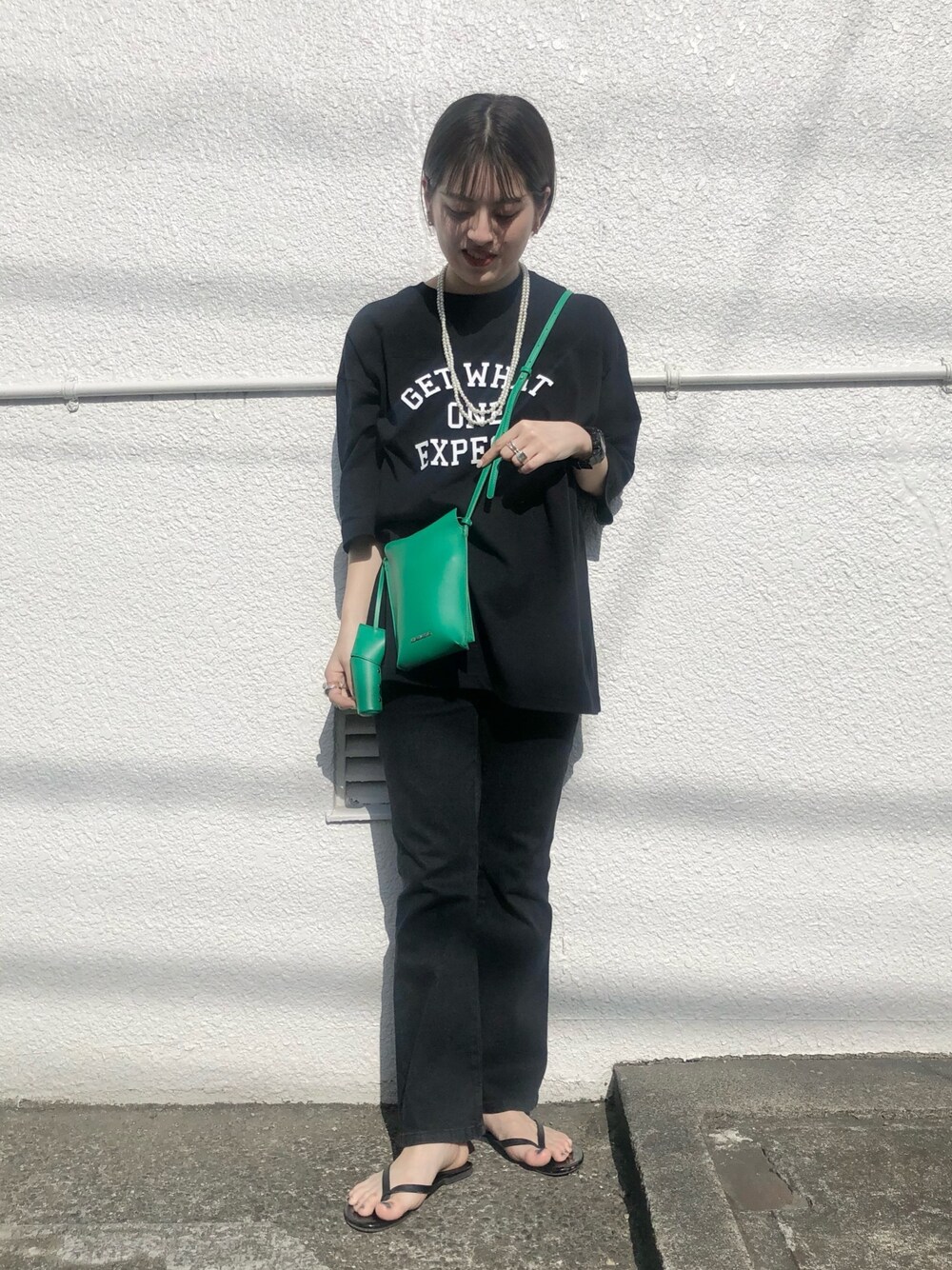 夏でもオールブラックが着たい🟢 重たくならないようにグリーンのミニバッグとパールのロングネックレスがポイント🌈
