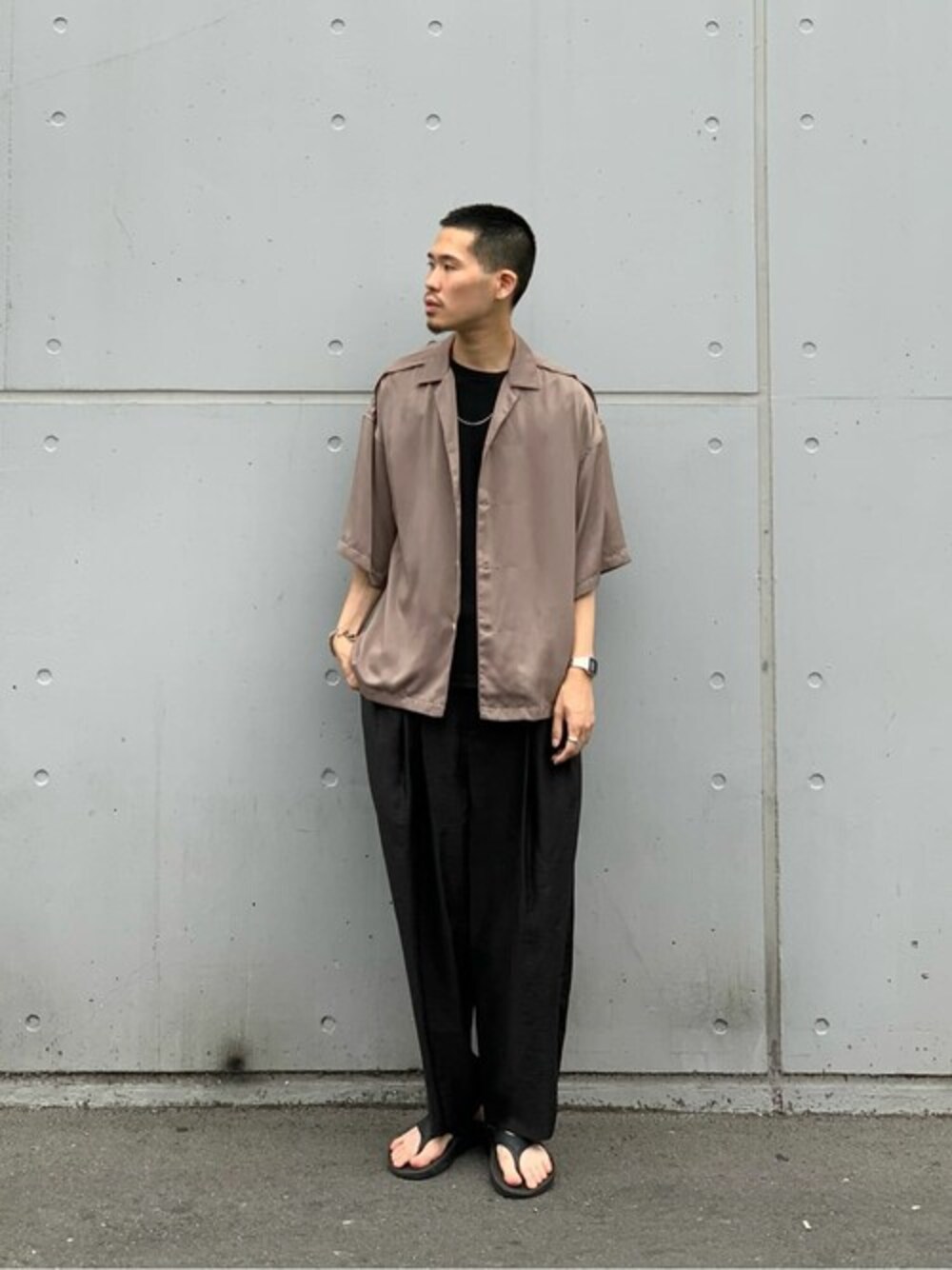 ブラック×ベージュで重すぎない夏のコーデに。 シャツはポリエステルのスエードで通気性もよく肌触りも◎ ワイドパンツで遊び心を。