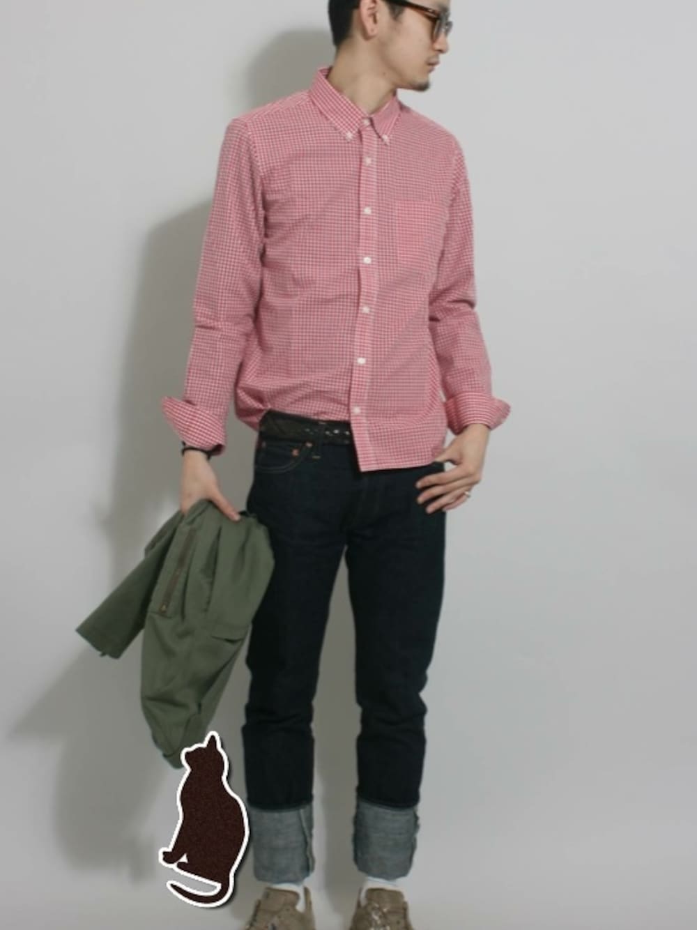 シャツにデニムの普通なスタイリング。だけどロールアップの幅や チョットのタックイン・メガネカラーで定番スタイル楽しみます