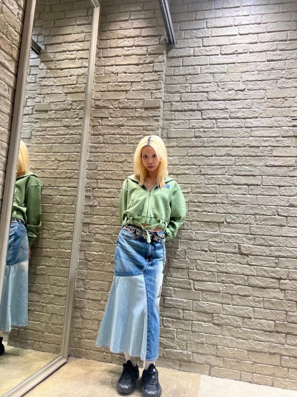 ふみ(HYSTERIC GLAMOURアミュプラザ博多店)のデニムスカート「VIXEN GIRL刺繍 スクラッチデニムスカート」を使ったコーディネート
