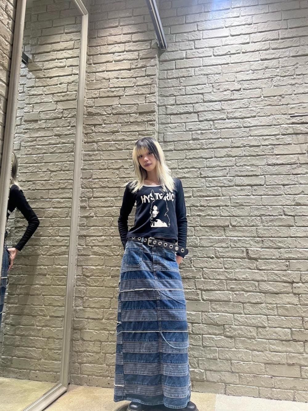 ふみ(HYSTERIC GLAMOURアミュプラザ博多店)のスカート「スクラッチロングデニムスカート」を使ったコーディネート