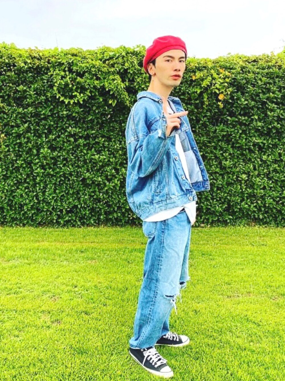 ご覧いただきありがとうございます👖✨ 今回はデニムオンデニムでコーディネート してみました🐶!差し色にピンクのベレー帽を 入れて足元はconverseにしてみました!