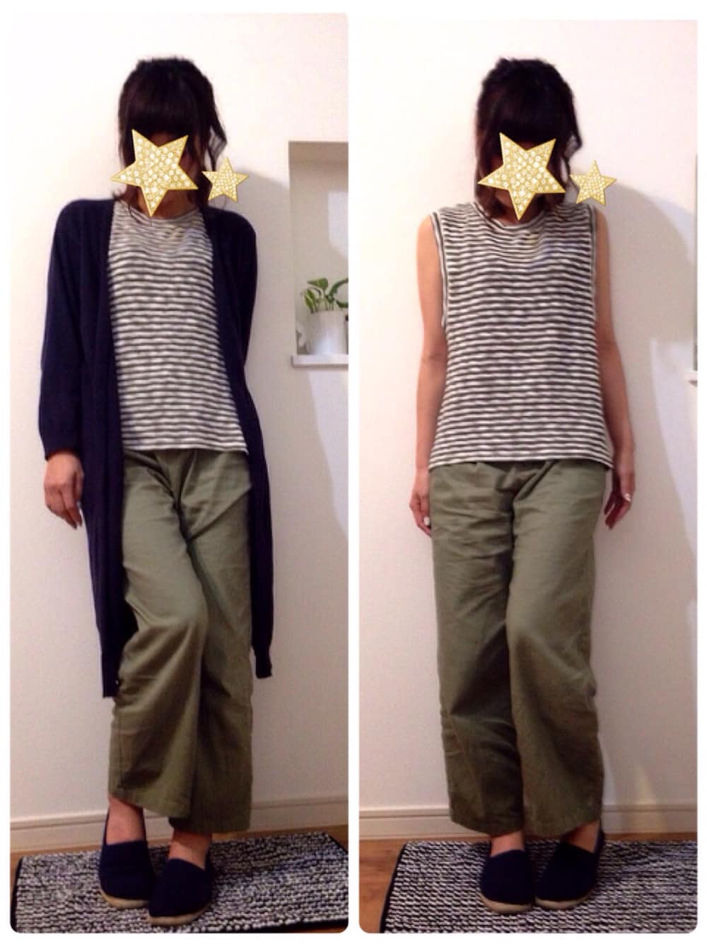 セットワンピのニットを クロップドワイドパンツに合わせて❤️ 今日は参観! 教室の中は暑くて羽織っていた ロングガウンを脱いでノースリーブに。。。