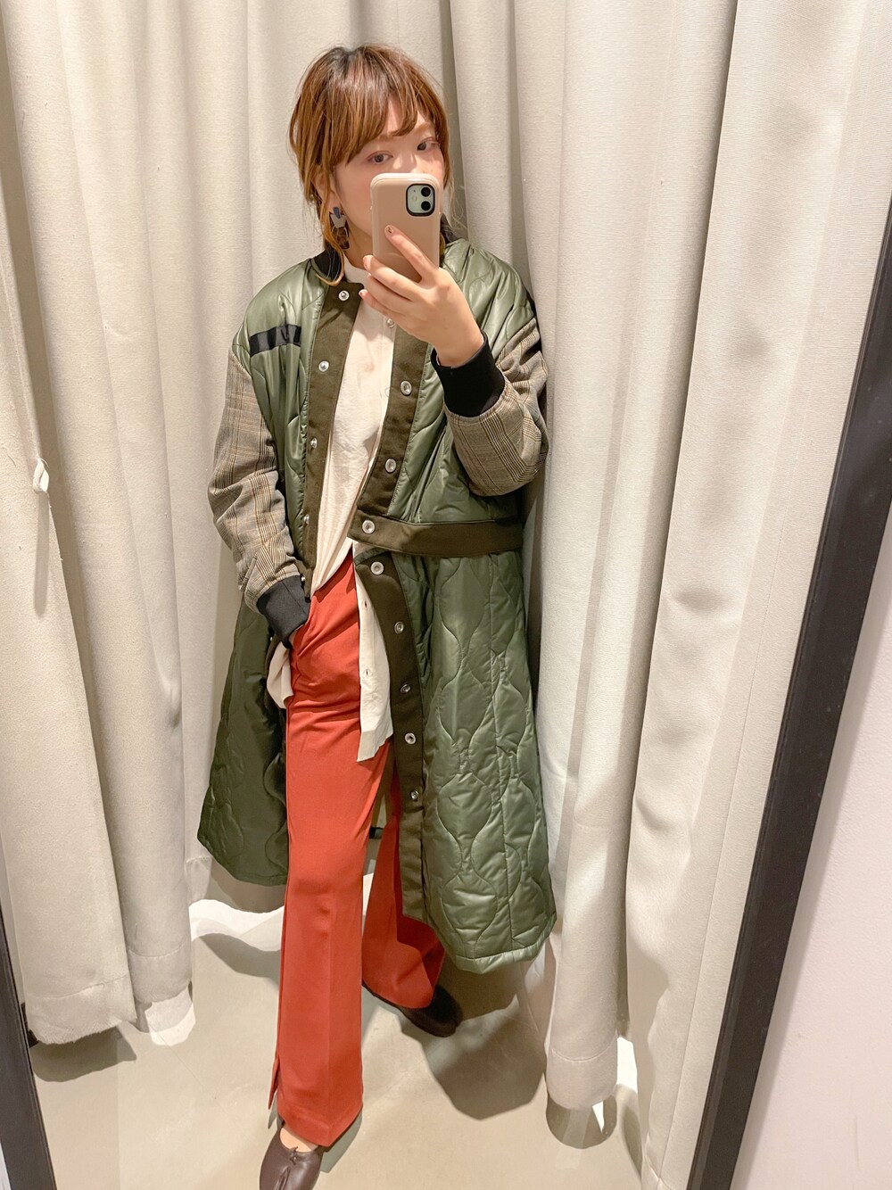 閲覧ありがとうございます😊 切り離してブルゾンにもなる2wayが 素敵! テラコッタのカラーパンツでカーキの色と対照的になるようにコーデしてみました♡