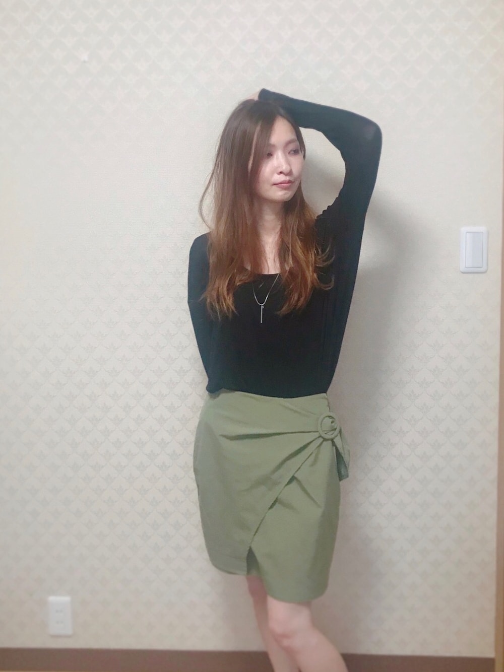 ZOZOでゲットした EMODAラップ巻きスカートコーデ❤︎ タイトな短い膝上フォルムだけど インナーパンツ付きのスカパンなので安心。 ミニスカートだと風強い時や階段の時 いちいち気掛かり。 最近はスカートにしか見えない、 お洒落なスカパン多いよねー❤︎ ラップ巻きなので、ウエスト調整できるし このカーキとも言えないくすみライムカラー、 モノトーンはもちろん、ボルドーやディープパープルとも合いそう。 着回し度も抜群! ちなみにトップスはForever24で学生のころ買った、薄ーいニット。 今の時期くらいしか着れない笑 背中がガッツリ空いてるので重ね着必須だったりと難易度高いのだけど、 薄くてゆるい素材なので、 タイトなボトムスと合う✨ ちょっとコーデの撮り方いつもより工夫してみたんだけど、 どうでしょうー_(:3 」∠)_?