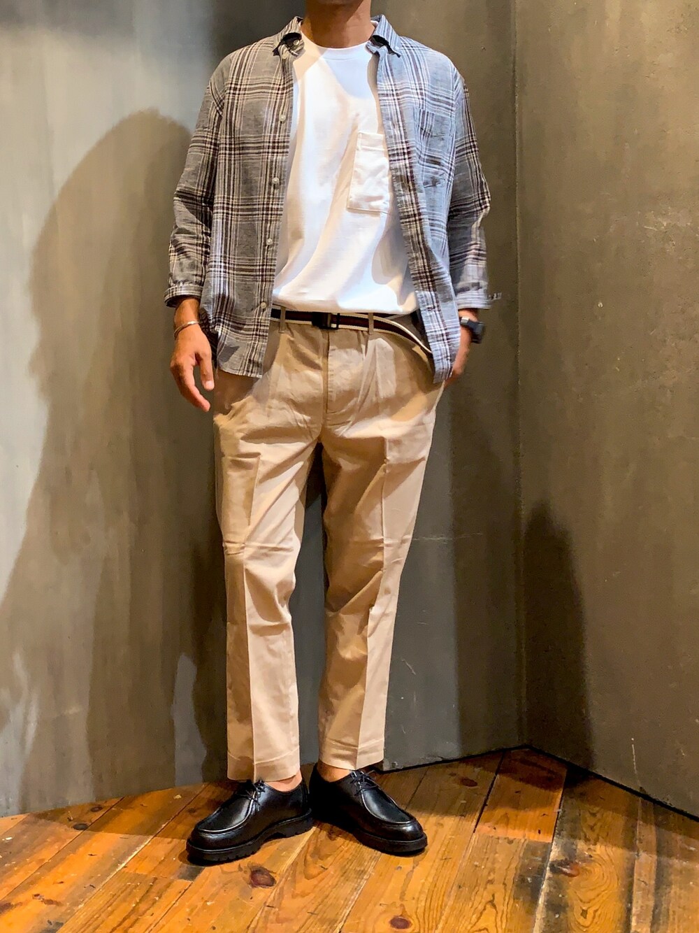 チェックシャツ×スラックス 大きめシルエットのTシャツは タックインして スッキリ見せてます。