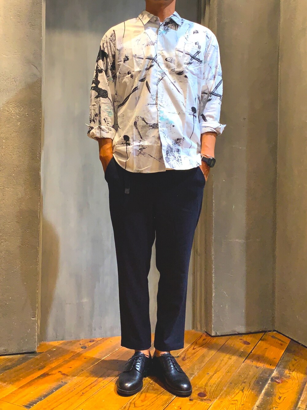 柄シャツ🎨 スラックスと革靴で キレイめなスタイリング✴︎