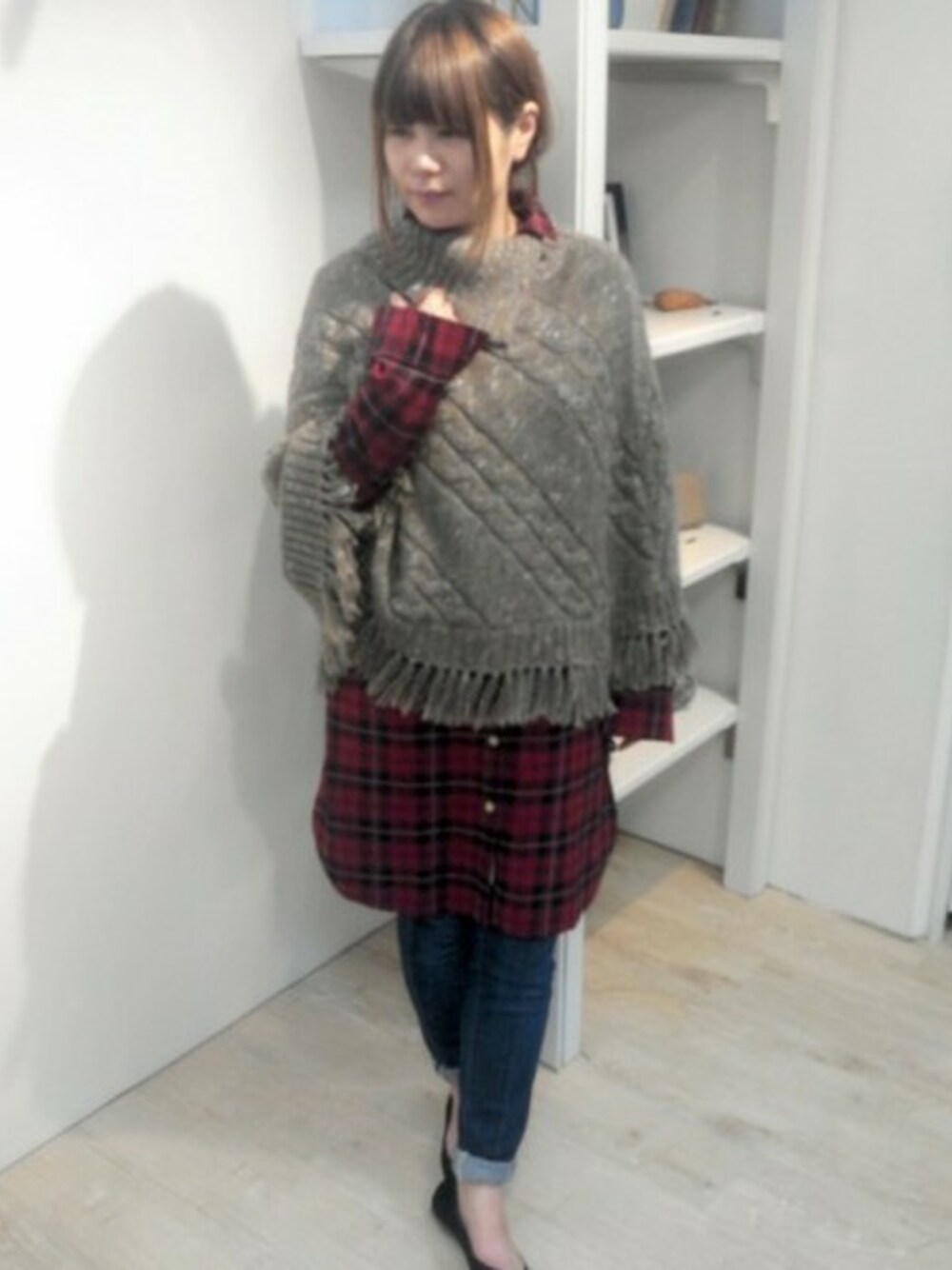 チェックシャツ×ポンチョで可愛らしく!