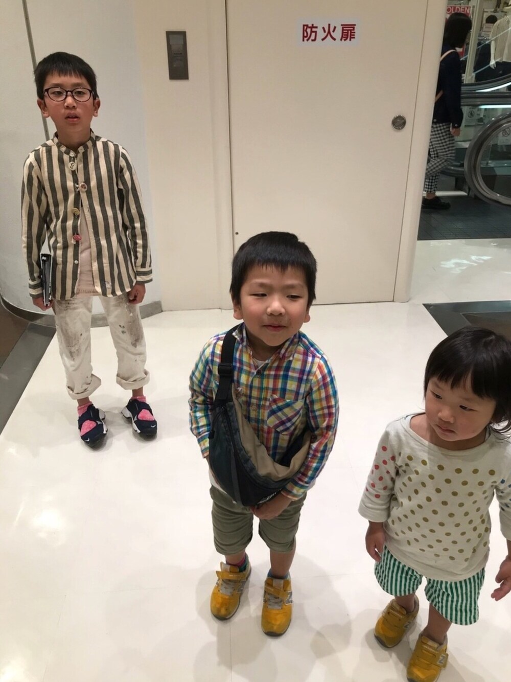 連休最後またGU前で。 長男以外はネタ切れで適当コーデです。 差し色でピンクを入れてみたけど写真で伝わらないですね。