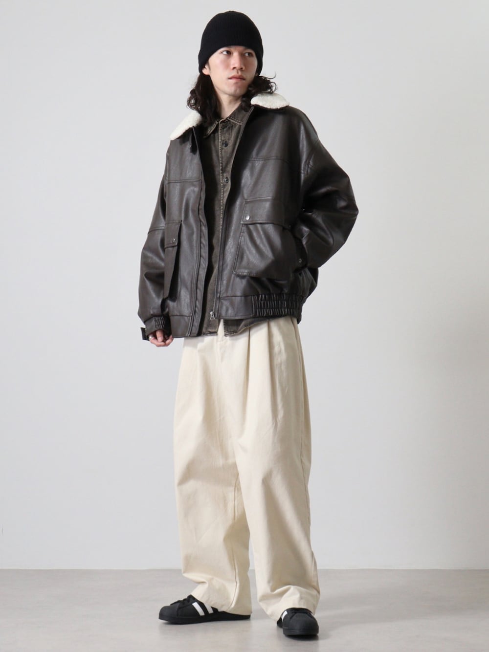 funalive_menのブルゾン「Fake leather blouson with boa collar / ボア衿脱着 G1 PUレザーブルゾン unisex」を使ったコーディネート
