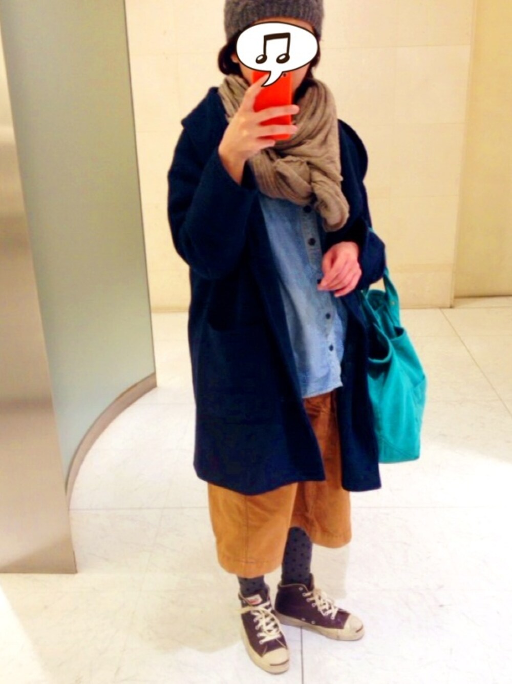 ノーカラーのデニムシャツ、オキニイリ♪ ストールで見えないし…(._.) アウター:global works デニムシャツ:cube sugar スカート:cube sugar ストール:mon sakata スニーカー:ジャックパーセル ニット帽:used バッグ:slow
