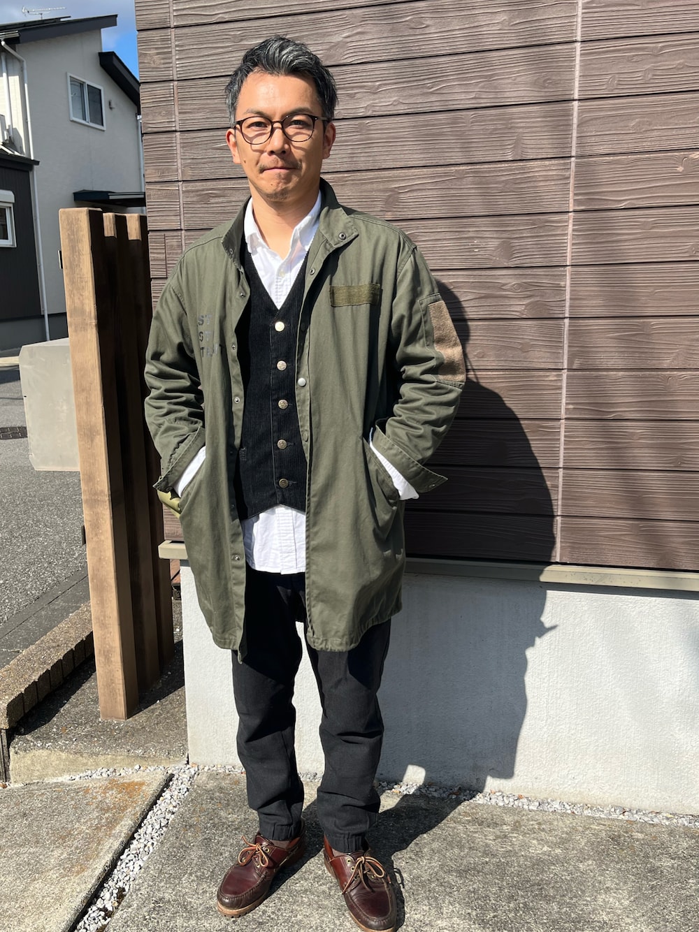 なんか少しだけ春めいた日もあるので、 白シャツメインに、薄手のミリタリーハーフコート、ベストとパンツは濃い色で締めて 足元はティンバーランドのデッキシューズで。 BBQやピクニックが出来る位の季節が待ち遠しい今日この頃です。