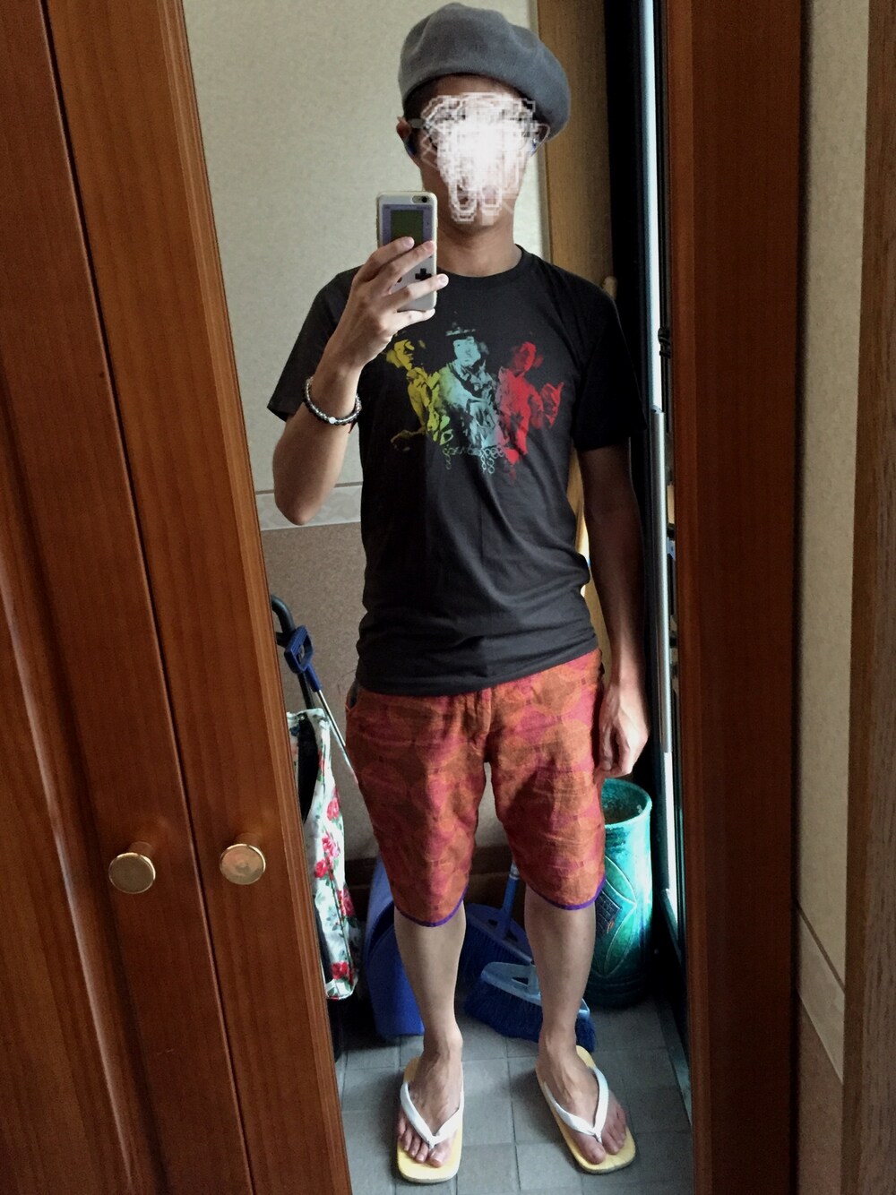 ジミヘンドリックスがプリントされた古着のロックTは超お気に入り✌️ そしていつものベレー帽に安定の雪駄👣