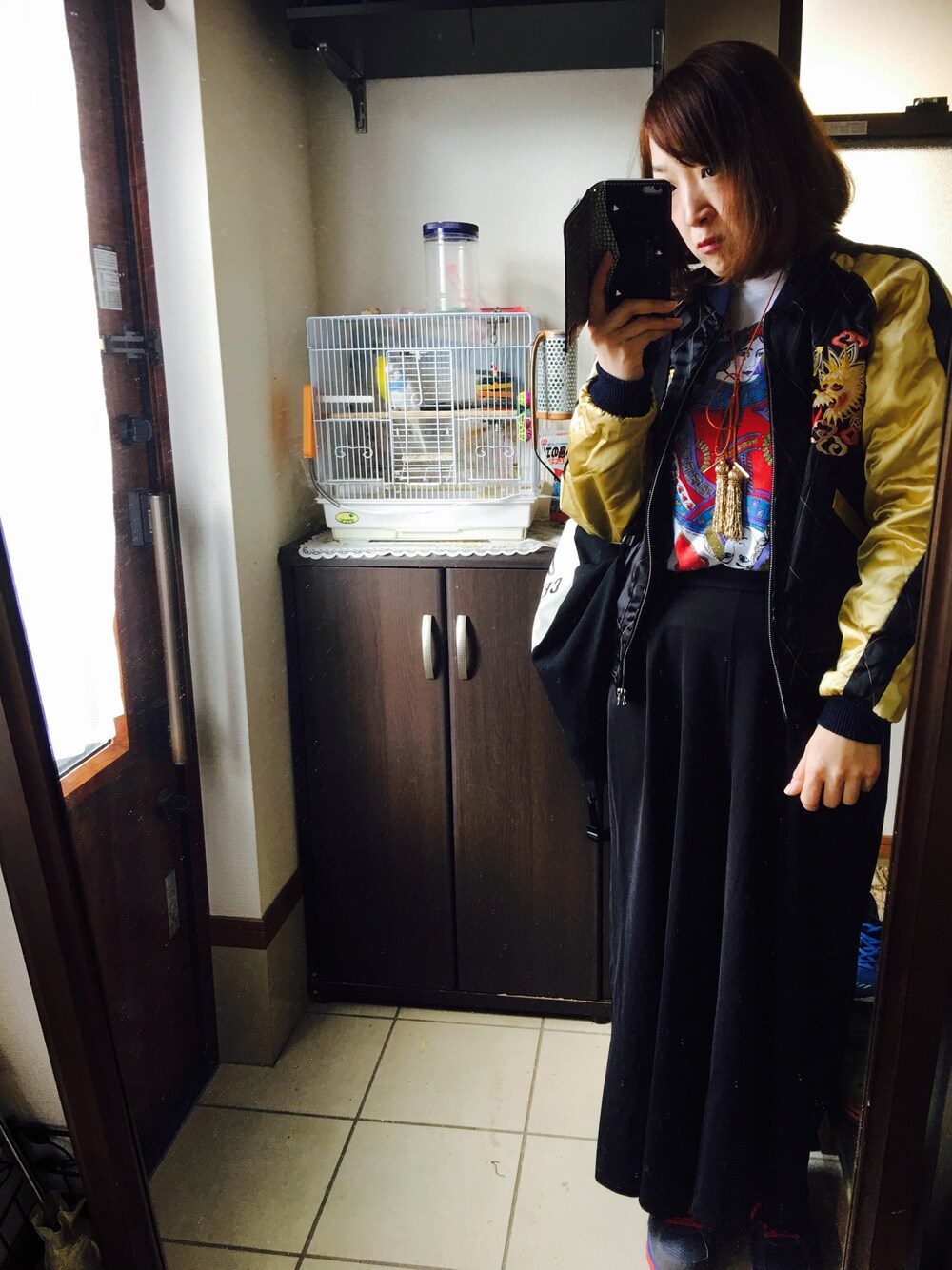 mちゃんからの頂きもののスカジャン‼️black✖︎goldがポイント^^ スェットは、スピンズでゲット。QUEENの表情にヤラレタ openingceremonyのリュックで抜け感プラス