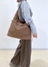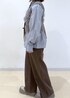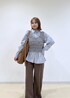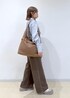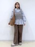 ブルーのシャツにブラウンのデニムとバッグを合わせたトレンドの色合わせを意識したコーディネートにしました♩ 少しカジュアルでラフですが、A4サイズが入る大きめのバッグに、きちんと感もあるシャツ合わせなのでオフィスカジュアルにもおすすめの組み合わせです! ※靴はスタッフの私物です。