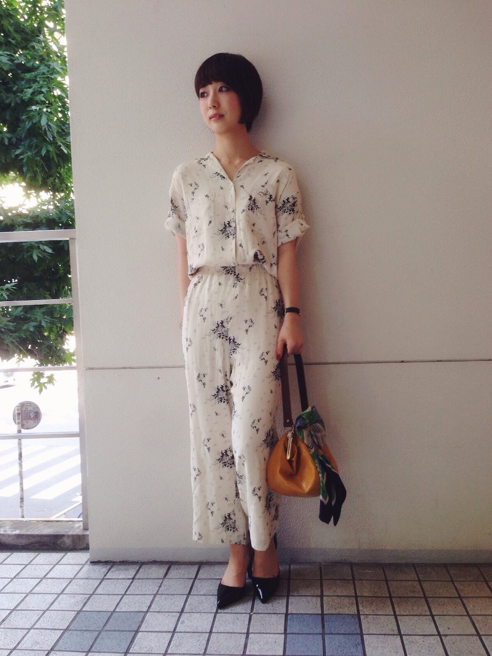 花柄のオールインワンは休日にバッチリです。 ヒールと合わせて大人のラフコーディネートにしてみました。