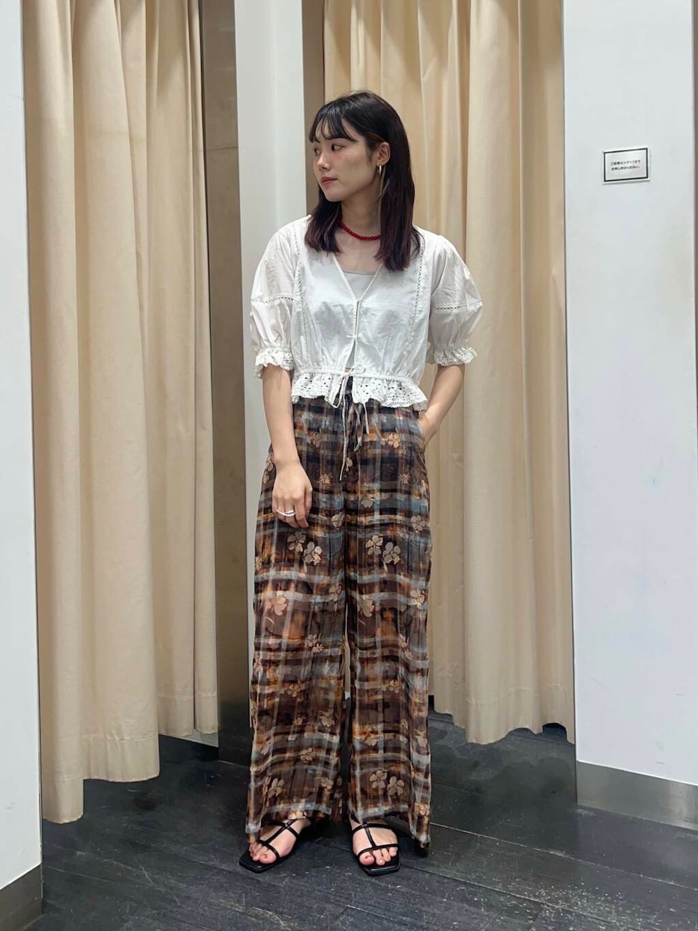 透け感のあるブラウスとゆるっと柄パンツの組み合わせが、涼しげで夏っぽさ満点!