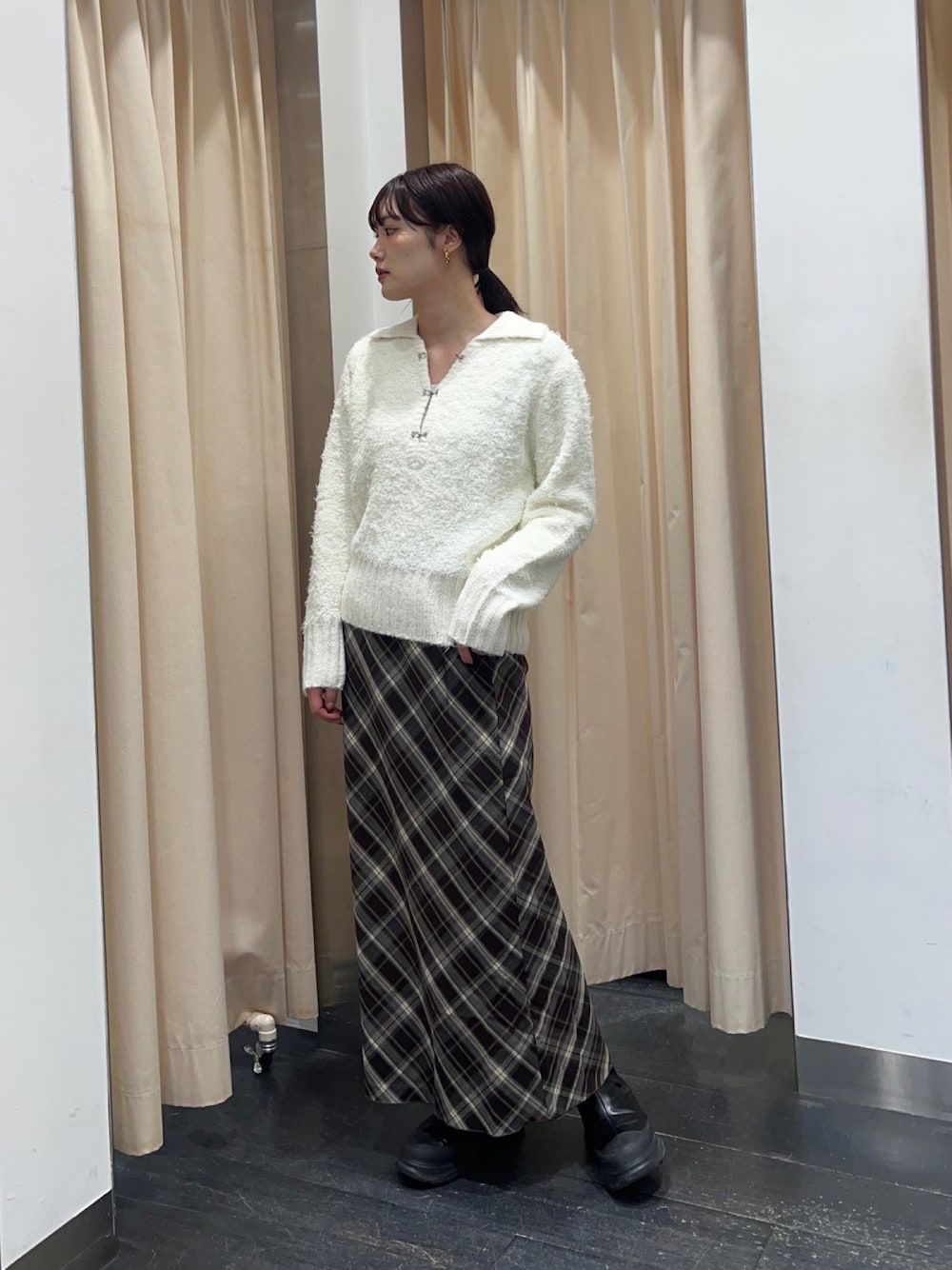 ふんわりしたニットは柔らくて着心地◎ チェックスカートと合わせることでより冬っぽく!