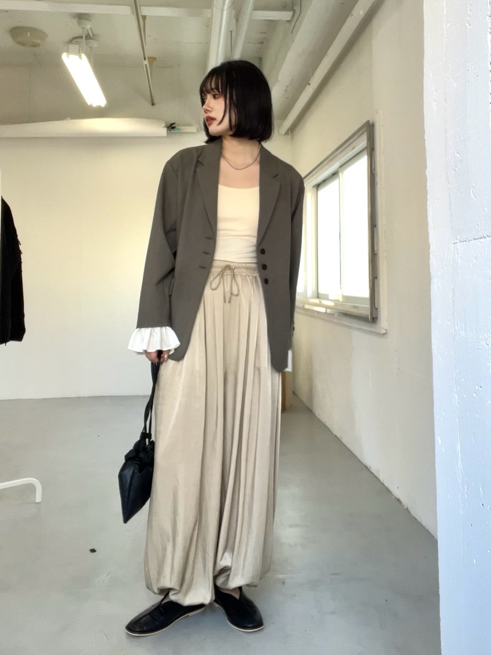 袖のフリルが可愛いジャケットにサテンバルーンパンツを合わせて着てみました! フリルは取り外しても使えるので、印象変えて楽しめます〜!