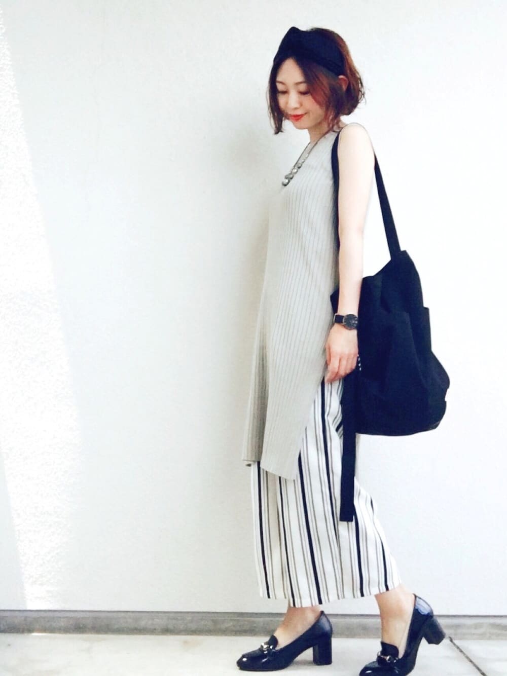 しまゆうのワンピース「ワイドリブ裾スリットノースリロングニットプルオーバー」を使ったコーディネート