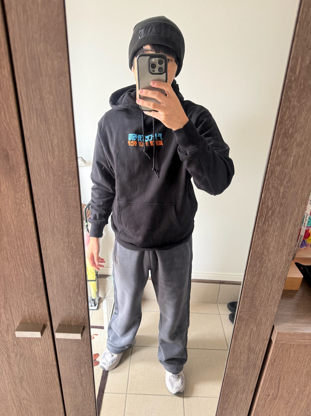 FACETASM×WINDANDSEAのパーカーとUNIQLO×needlesのフリースパンツコーデになります。