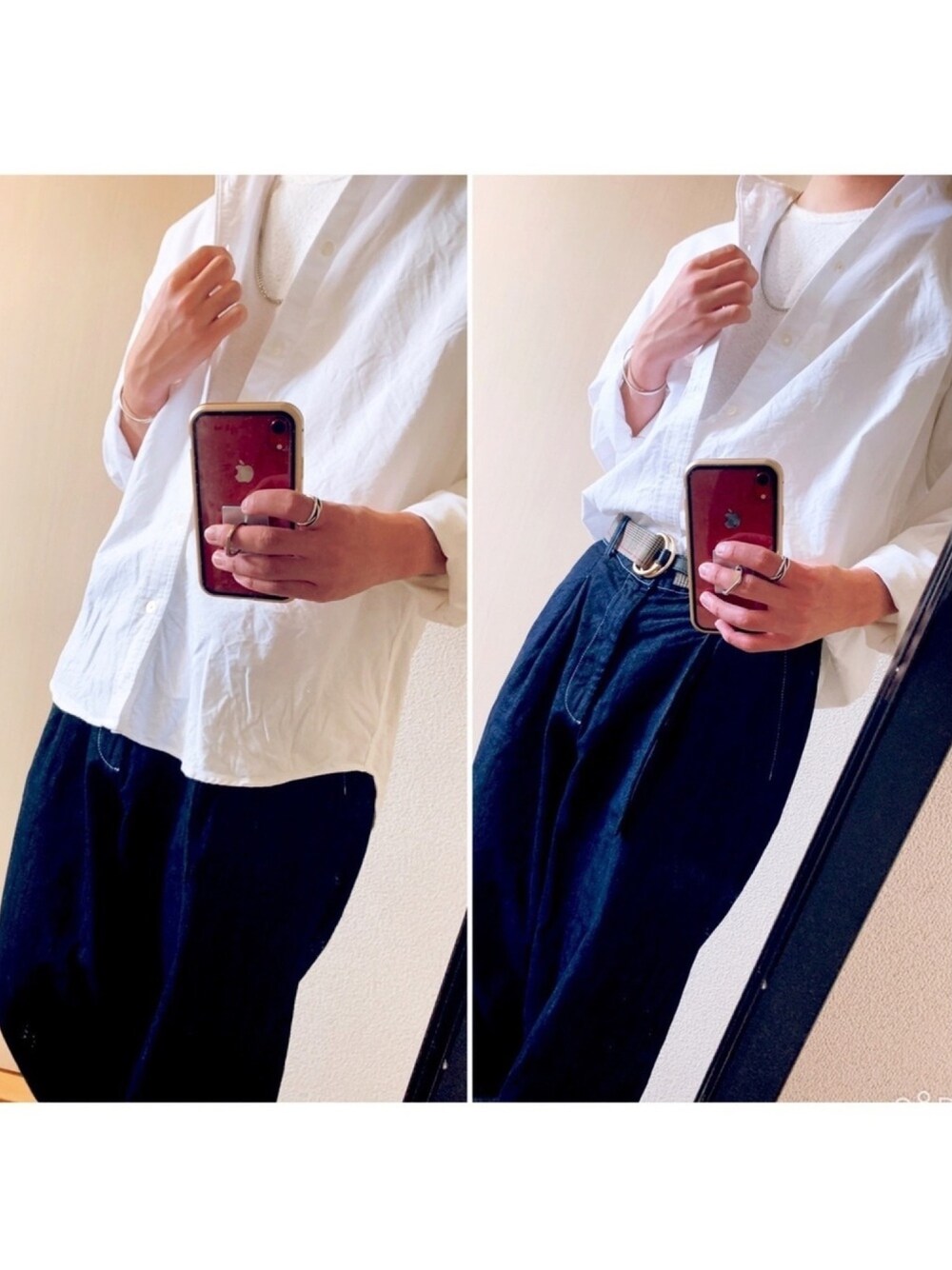 ワイドテーパードデニム着回しコーデ シンプルなゆるコーデ😊 タックインに抵抗がある方は左のように、スタイルをよく見せたい方は右のようにタックインにしてみては!! 個人的にはタックインした方がすきかな😁 今回はDr.Martinを履きましたがこの服装なら大体なんでも合う気がします!