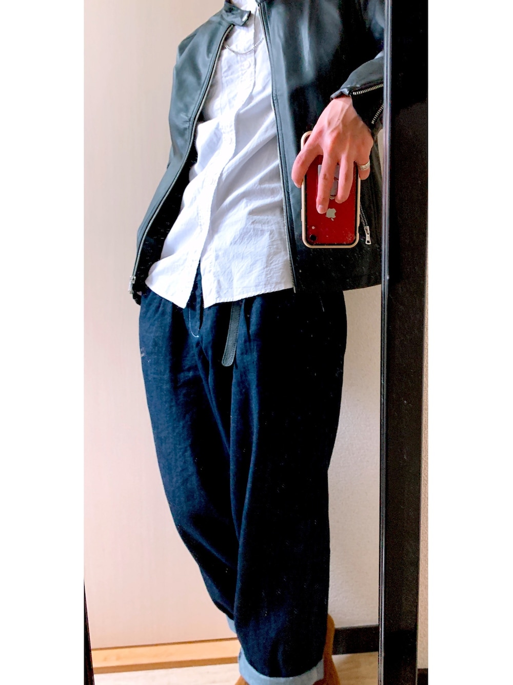 ワイドテーパードデニムの着回しコーデ 今回はライダースと合わせてみました! 黒スキニーなどで決めすぎずゆったりとした雰囲気で僕は好きです😁 今回はAIR MAX90 と合わせましたがDr.Martinなどの革靴と合わせてもきれいにまとまると思います!